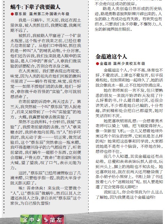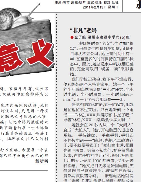 童联社温州作文网学员金子皓《“非凡”老妈》(温州市建设小学六年级)、蔡东辰《蜗牛:下辈子我要做人》(温州第二外国语六年级)、金蕴迪《金蕴迪这个人》(温州少美校五年级)发表在2011年2月13日温州商报新作文版。