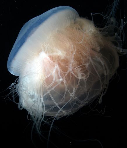 一只在水箱中游动的drymonema larsoni水母。这只水母在阿拉巴马州沿海被研究人员捕获。drymonema水母主要以其他水母为食,触须的刺细胞力量很大,人类在接触时也能感觉得到。拜哈说:“它们是一群真正恶毒的刺客。缠绕你的触须越多,刺击的威力就越大。这些家伙长有数百条触须。”