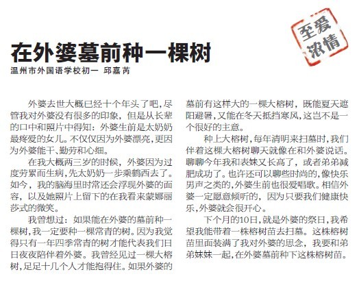 童联社温州作文网学员邱嘉芮(温州市外国语学校初一)佳作《在外婆墓前种一棵树》在2011年4月17日温州都市报新苗版“至爱浓情”栏目发表。