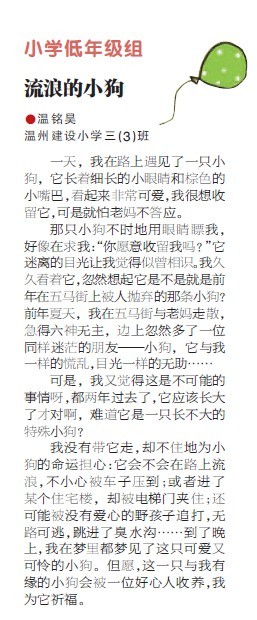 童联社温州作文网学员温铭昊(温州市建设小学三年级)佳作《流浪的小狗》在2011年4月17日温州商报新作文版发表。