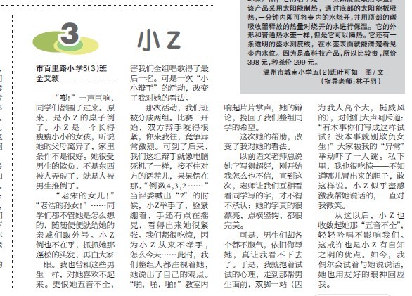 童联社温州作文网学员金艾颖(百里路小学五年级)参加温州日报征文佳作《小z》发表在2011年5月16日作文版。