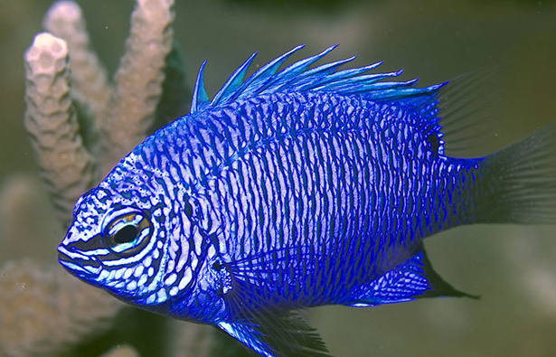 小热带鱼chrysiptera cymatilis艳丽的蓝色令人吃惊。这一物种发现于巴布亚新几内亚米尔恩湾中,米尔恩湾拥有一片原始珊瑚区域,是大量鱼类的快乐家园。