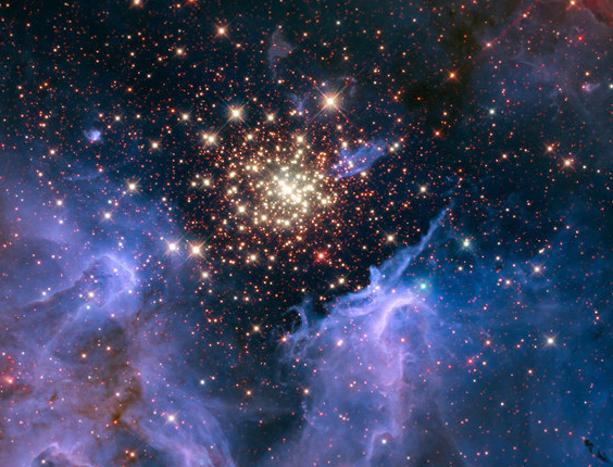 这个星云位于船底座,距离地球约2万光年,其中央部位有一个由炙热的大质量新生恒星组成的星团,编号ngc 3603。这张照片由哈勃空间望远镜使用广角相机-3于2009年8月至12月间拍摄。