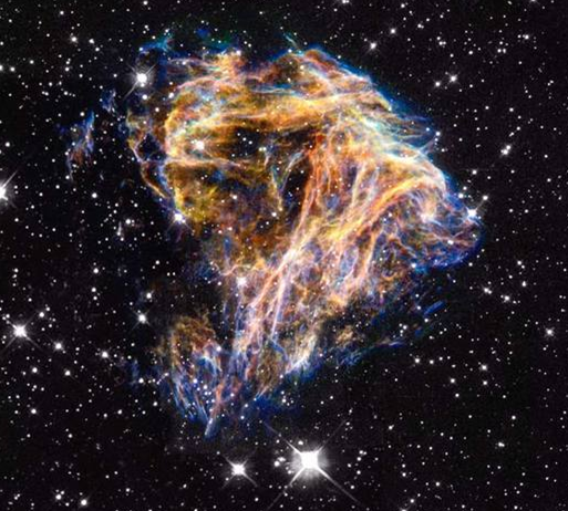 这是一个超新星遗迹,编号lmc n 49,其中的lmc指代小麦哲伦星云。它看起来结构精细,就像是烟火凌空炸开后留下的袅袅浓烟。这其实是超新星剧烈爆发之后抛射出的物质外壳。
