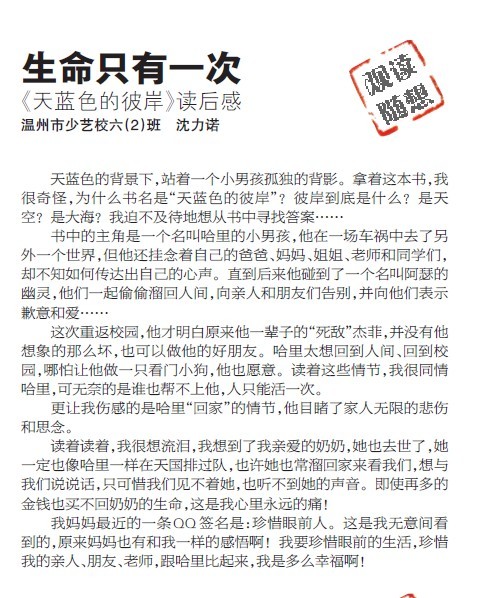 童联社温州作文网学员沈力诺佳作《生命只有一次》(儿童小说《天蓝色彼岸》读后感)在2011年9月5日温州都市报新苗版“观读随感”栏目发表。