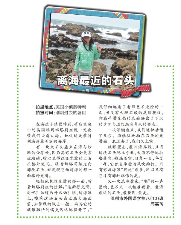 童联社温州作文网中学创作班学员邱嘉芮佳作《离海最近的石头》在2011年9月25日温州都市报新苗版发表。