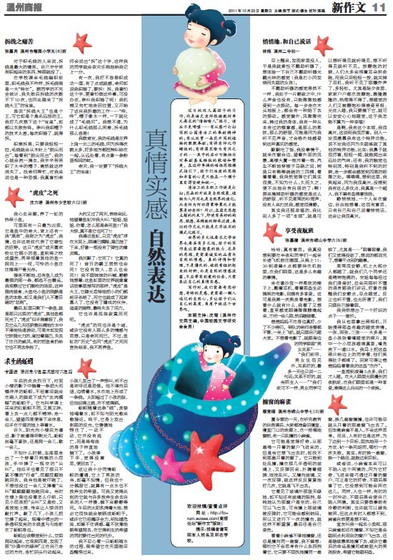 童联社温州作文网学员张嘉芮(籀园小学五年级)《拆线之痛苦》、沈力诺(少艺校六年级)《“虎皮”之死》、金蕴迪(少美校六年级)《求生的蚯蚓》、林炜(温州二中初一)《悄悄地,和自己说话》、张嘉倩(绣山中学六年级)《享受夜航班》、蔡竞瑶(绣山中学七年级)《撞窗的麻雀》等6篇佳作在2011年10月23日温州商报新作文版发表。专版主题为“真情实感 自然表达”,特邀童联社沈楚老师主持。