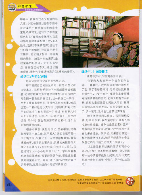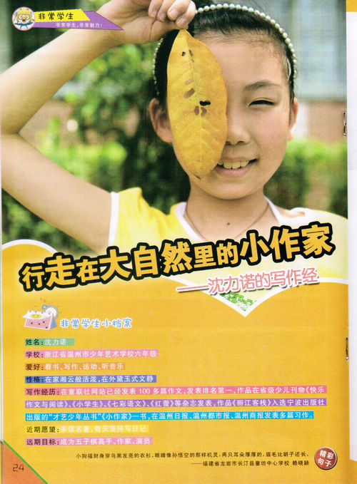 童联社温州作文网学员沈力诺入选全国优秀少儿期刊山西青少年报刊社出版的《小学生》杂志2011年第10期“非常学生”。