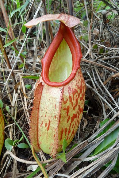 这是一种喜欢吃肉的植物,高度达到近40英寸(约合100厘米),是2010年在大湄公河流域发现的5种肉食性猪笼草之一。这种肉食性猪笼草学名“nepenthes holdenii”,科学家只在两座山峰上发现它们的踪迹,均位于柬埔寨的豆蔻山脉。豆蔻山脉的海拔高度在1970到2625英尺(约合600到800米)之间。其他4种肉食性猪笼草是在泰国发现的。 世界自然基金会的查普曼表示:“这种植物能够散发出香气,诱捕没有疑心的猎物,例如昆虫、小型哺乳动物,甚至于鸟类。它们的瓶状叶中含有酸性成分,用于消化溺死的猎物。对于植物来说,这是一种非凡的适应能力。它们的生长并不单纯依靠从贫瘠的土壤中吸收营养物质,同时也捕食小动物补充营养。”