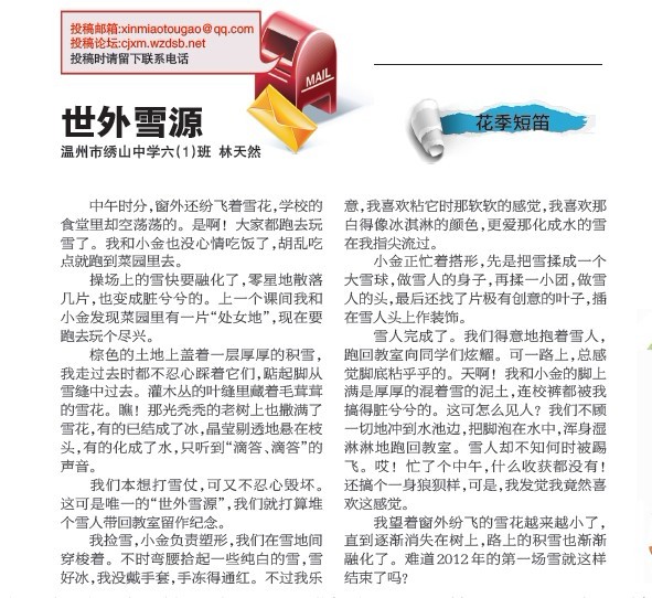 童联社温州作文网学员林天然佳作《“世外雪源”》在2012年1月8日温州都市报新苗版“花季短笛”栏目发表。