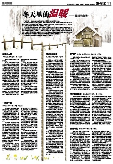 童联社温州作文网学员卓玲珑《温暖在人间》、林天然《一杯热牛奶》、沈力诺《邓老师的温暖》、赵育琇《回“家”》、俞柏康《哈尔滨的温暖》、柳畅《两种夸奖》等佳作在2012年1月15日温州商报新作文版发表。