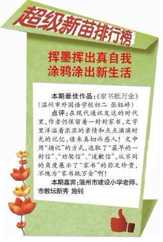 童联社学员张钰婷佳作《家书抵万金》在温州都市报2012年1月15日新苗版发表,并获“超级新苗排行榜”本期最佳作品。