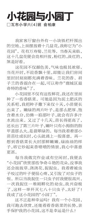 童联社温州作文网学员俞柏康佳作《小花园与小园丁》在2012年4月1日温州都市报新苗版发表。
