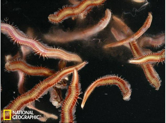 图中这些火刺虫正聚集起来一起产卵。它们身上的有毒刚毛清晰可见。这些刚毛中间其实是一种充满毒质的管道,管道容易破碎,只要一碰到就会破裂并释放出毒液,因此这也是它们用来驱逐捕食者的方式之一。当人类触碰到这种蠕虫时,也会产生严重的皮疹症状,令人痛苦不堪。