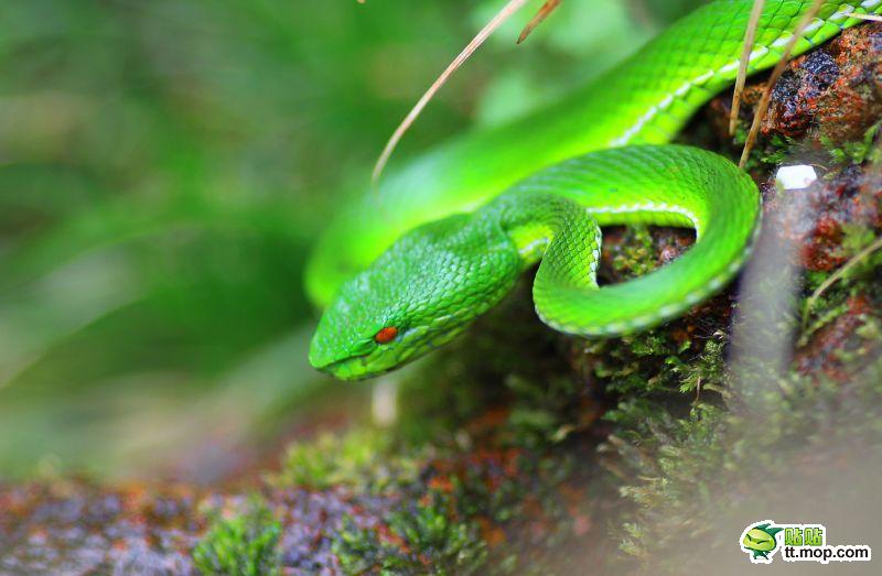 竹叶青:头呈三角形,瞳孔垂直呈红色,颈细,全身鲜绿色,尾端焦红色,上颌仅具管牙,有巨毒。多栖息于山林、菜地中,喜欢缠绕在树枝上或竹枝上,常在早晨和晚间活动。蛇一般不主动攻击人,希望读者发现它时远离它(保护野生动物,人人有责)。