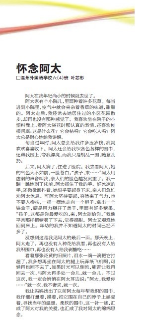 童联社温州作文网学员叶芯彤、黄振豪佳作《怀念阿太》、《苍蝇先生》在2012年4月22日温州都市报新苗版发表。