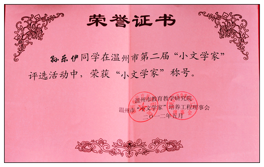 童联社温州作文网学员孙乐伊(温州市实验小学六年级)获得2012年温州市“小文学家”称号。