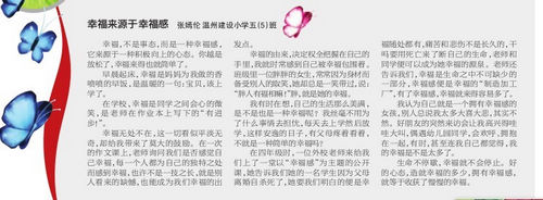 童联社温州作文网学员张嫣伦参加温州市第七届中小学生作文大赛获一等奖现场作文《幸福来源于幸福感》在2012年6月17日温州商报新作文版发表。