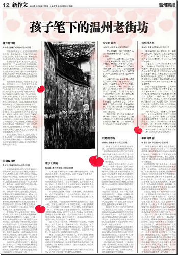 童联社温州作文网五年级学员探访“温州老街坊”随笔专版在2012年6月24日温州商报新作文专版发表,孩子们笔下的“老街老巷老院子”别有一番情趣。