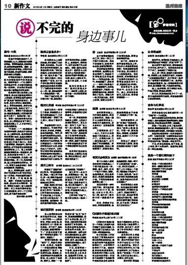 童联社温州作文网学员李依宸《温州以前是水乡?》、李承怿《随时记灵感》、王奕东《盼》、包梓铃《雨滴》、金琦皓《遇见三轮车》、吴雨澄《有其父必有其女》、张邹鲁《破烂变肥料》、余怡恬《让老爸减肥》、黄奕乔《金鱼与红掌花》等佳作在2012年8月12日温州商报新作文版发表。