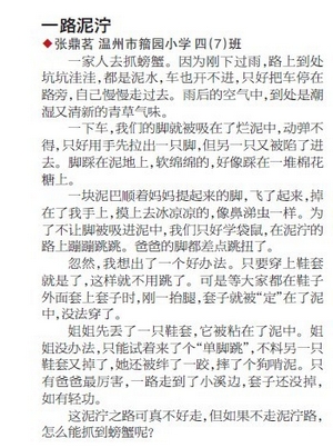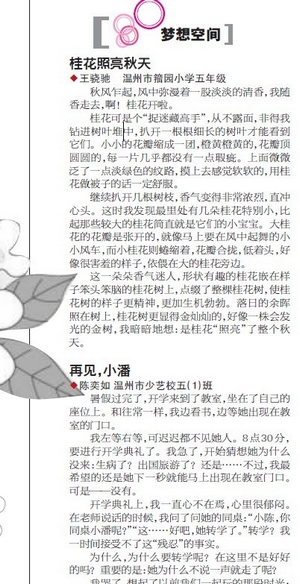 童联社温州作文网学员王骁驰《桂花照亮秋天》、陈奕如《再见,小潘》、张鼎铭《一路泥泞》在2012年10月21日温州商报新作文版发表。