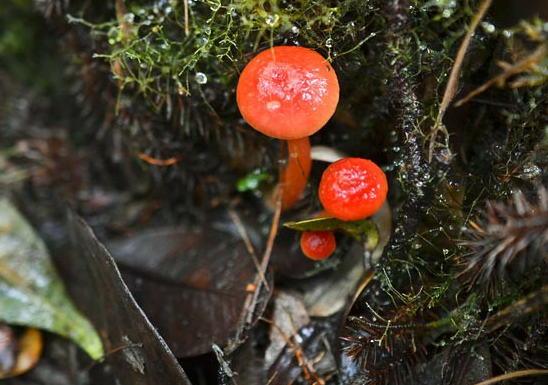 这种小型红色菌类也是此类科考发现的数百种菌类之一,它发现于森林地面之上。这种菌类是在夜间被发现的,当时它看起来似乎正发出明亮的光芒。研究人员认为,这种菌类发出荧光主要用于吸引昆虫来帮助它们传播孢子。