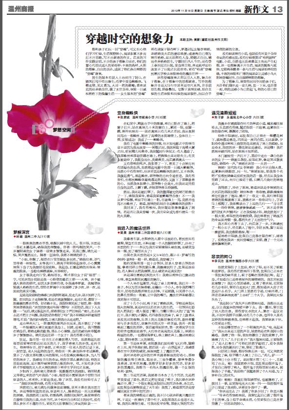 温州作文网“穿越时空的想象力”专辑在2012年11月18日温州商报新作文版发表,专辑由童联社黄蒙老师主持,刊发了学员林璐(温二中九年级)《梦醒深宫》、梁晨(温州二外八年级)《我进入的魔法世界》、朱子彦(永嘉瓯北中心小学六年级)《遇见清照姐姐》、李民恰(籀园小学六年级)《悲哀的阿q》、张家诚(温州城南小学六年级)《变身蜘蛛侠》等5篇引人入胜的“穿越”故事。 穿越的魅力在于想象,在于想象中的思想新意。有了丰富的体验和广博的阅读,才能自由演绎精彩的想象。