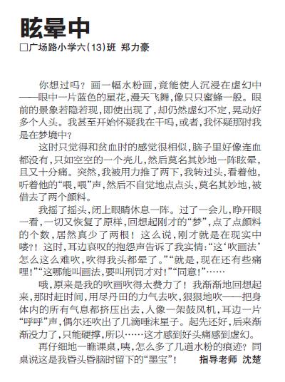 童联社温州作文网学员郑力豪佳作《眩晕中》在2012年11月25日温州都市报新苗版发表。