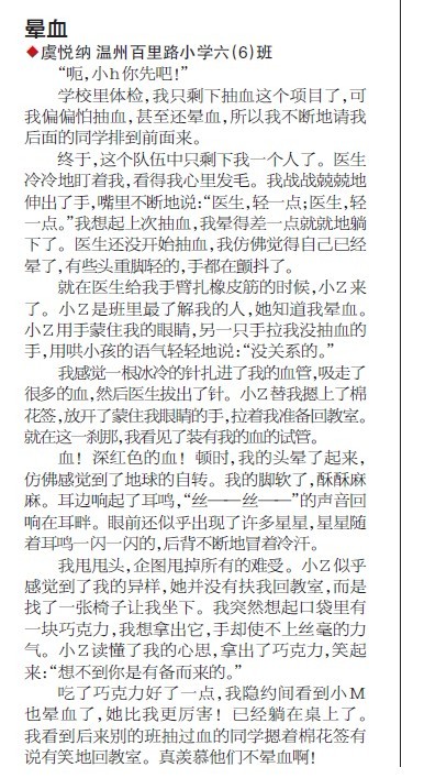 童联社温州作文网学员虞悦纳佳作《晕血》在2012年12月2日温州商报新作文版发表。
