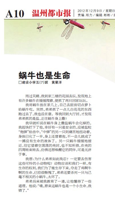 童联社温州作文网学员黄星洋佳作《蜗牛也是生命》在温州都市报新苗版发表。