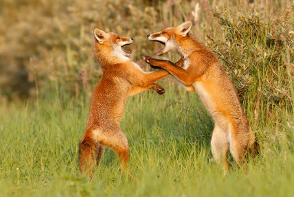 【火狐】又叫红狐、赤狐等,它们的住处常不固定,而且除了繁殖期和育仔期间外,一般都是独自栖息。求偶期间,雄兽和雌兽通过尿液中散发出的类似麝香一样的气味互相吸引,受到雌兽引诱的雄兽会发出古怪而又可怕的尖叫声,进行一种复杂的求婚方式。
