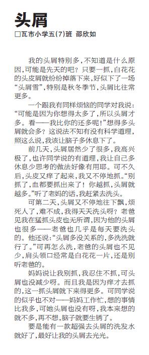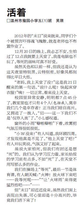 童联社温州作文网学员吴限佳作《活着》、邵欣如佳作《头屑》在2012年12月30日温州都市报新苗版发表。