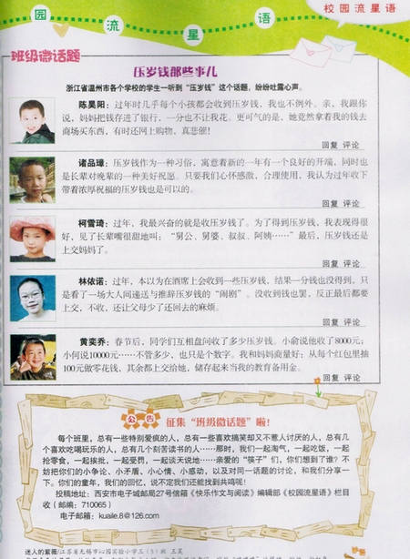 童联社温州作文网学员陈昊阳、诸品璋、柯雪琪、林依诺、黄奕乔参加《快乐作文与阅读》杂志“班级微话题”讨论,讲一讲“压岁钱那些事儿”。