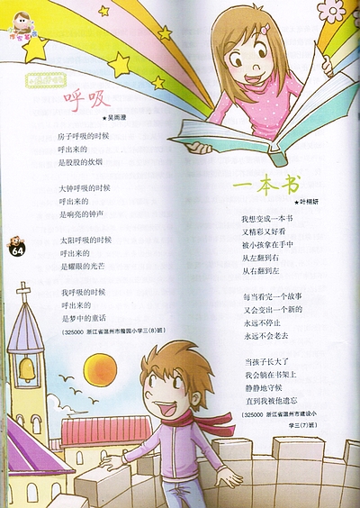 童联社温州作文网学员吴雨澄、叶栩妍创作的儿童诗在全国优秀少儿期刊《作文大王》上发表,分别是《呼吸》、《一本书》。