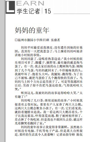 童联社温州作文网学员张鼎铭佳作《妈妈的童年》在2013年8月4日温州晚报发表。
