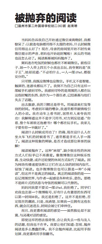 童联社温州作文网学员赵育琇、王禾莹佳作在2013年9月9日温州都市报发表