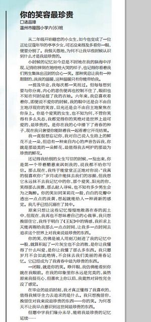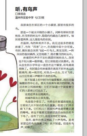 童联社温州作文网中学创作班学员李民洽佳作《听,有鸟声》、诸品璋佳作《你的笑容最珍贵》在2014年7月28日温州都市报新苗版发表。