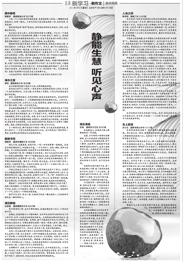 《静能生慧,听见心声》专辑温州商报2014年8月3日刊发。童联社学员陆馨雨、章程、胡凯程、李漠、陈梓涵、谷心仪佳作入选。