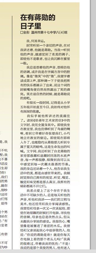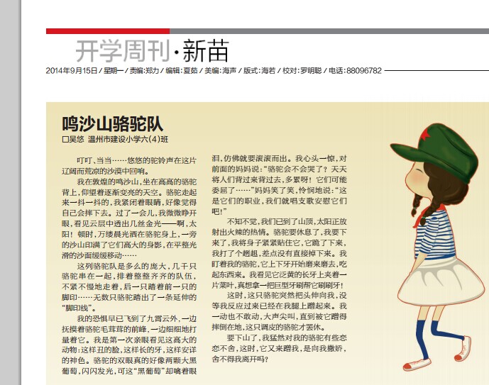 童联社温州作文网学员全彤《在有蒋勋的日子里》、吴悠《鸣沙山骆驼队》在温州都市报2014年9月15日新苗版发表。