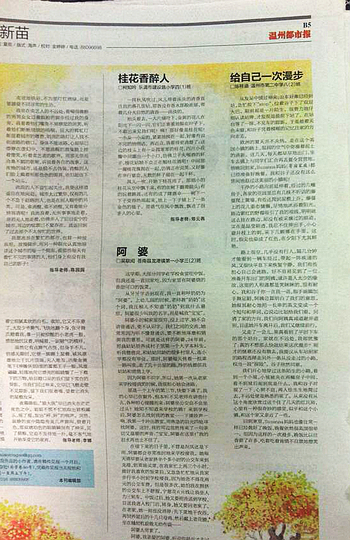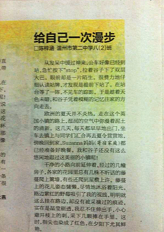 童联社温州作文网学员陈梓涵《给自己一次漫步》在温州都市报2014年10月27日新苗版发表。
