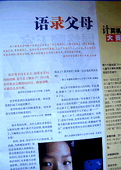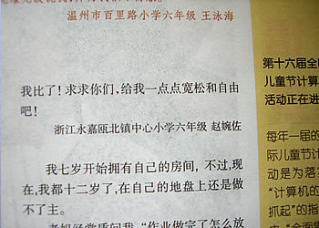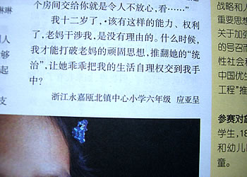 沈老师作文教室小学员王泳海、赵婉佐、应亚呈语录在国家双效期刊《小学生》表达版07年第一期上发表。他们都是针对父母发表自己的看法意见。