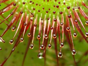 扫墓那天,舅舅在又滑又绿的苔藓里,发现了一种红中带绿的植物,看起来毛茸茸的很可爱。仔细一看,每片叶子上长满了触角,每只触角顶部,都有一滴晶莹剔透的露珠。在阳光的照射下,显得绚丽多彩,非常吸引人。