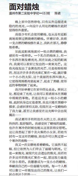 童联社温州作文网学员陈诺《面对蜡烛》在温州都市报6月19日新苗版发表。