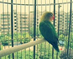 其实我挺喜欢我的主人的,总会逗我们玩,只是有时会很粗心,比如刚才那样冲澡,但这都不算什么。我的主人喜欢拿一根竹杠放在笼子的最高处,那时我都会以一个漂亮的“冲上云霄”飞上去,借此机会向主人讨小米吃,而依依好像有点怕人,不敢上前。主人也常常会给我们买一磨牙用的或玩耍用的小玩具,十分有趣。而当给我们“正常”玩澡时会很温柔地洒水,还是蛮舒服的,她还总是把我们带出去晒日光浴等等。