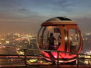 广州塔是一个非常高的塔,他最高的位置有453米高。这个高度对恐高症患者就是最大的“杀器”,但是这还不是最厉害的,最厉害的是在这个位置坐摩天轮,而且全长十五分钟,这就是恐高症患者的噩梦。但我却“做”了这个噩梦,刚开始的时候,我内心一直是拒绝的,但在大人的激将法下我只好上摩天轮。
