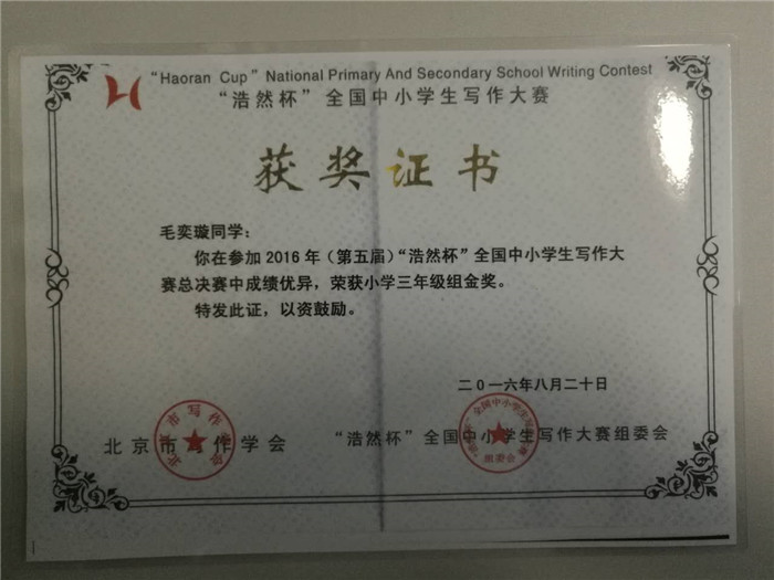 毛奕璇“浩然杯”作文大赛获金奖