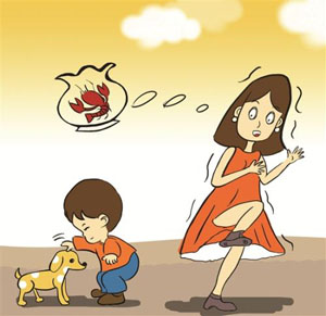 我怕狗,当我看见狗时,我总会跑得远远的。 有一次,我和爸爸正在散步,突然窜出一群狗,我怕得动也不敢动,爸爸却大胆地走过去。 狗离我越来越近,它们吐着舌头,露出锋利的牙齿,仿佛要咬我一口。 爸爸在那边喊:"别怕,它们不会咬你的。” 我鼓足勇气,才飞奔到爸爸那边,差一点扑倒在地上,魂都吓没了。