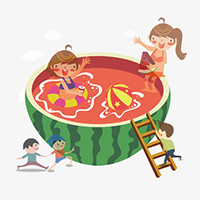 西瓜汁很多,那么多汁,加起来会不会变成游泳池呢?我在吃西瓜时,一不留神,看到了这个有趣场面。红色的西瓜游泳池,半个大西瓜,里面还有很多黑色西瓜籽小鱼在游泳,小朋友们边游边喝西瓜汁,肚子喝得饱饱的,圆圆的,成了“水上气球”,真是太幸福了!