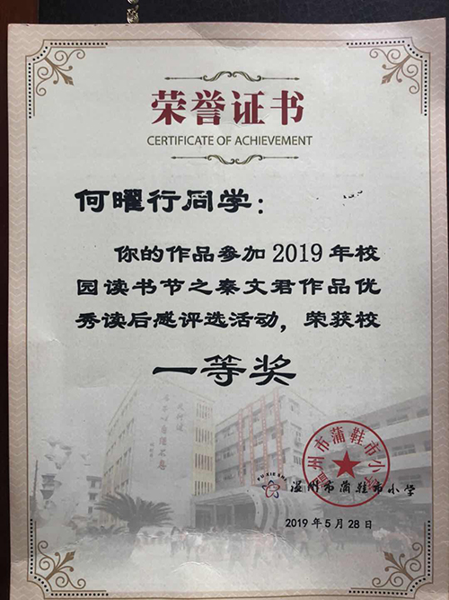 何曜行获2019校读后感评选活动一等奖