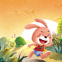 大象发令员喊:“三,二,一,准备,跑!”兔子一个劲冲上楼梯,转转头看看乌龟,还在后边慢吞吞地爬着。